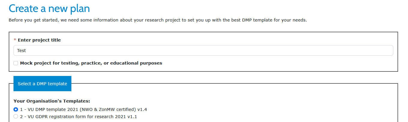 If you’re aiming to write a full DMP based on VU Amsterdam DMP template, please make sure you don’t select the GDPR registration form.