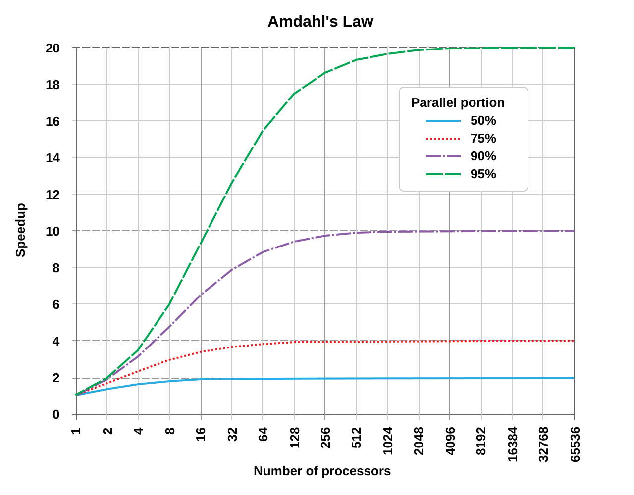 Amdahls law is formula that shows how much faster a task can be completed when more resources are added to a system. In the context of P (fraction of the code that can be parallelized) and N (number of processors) the speedup is defined as follows: